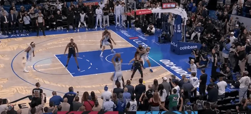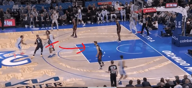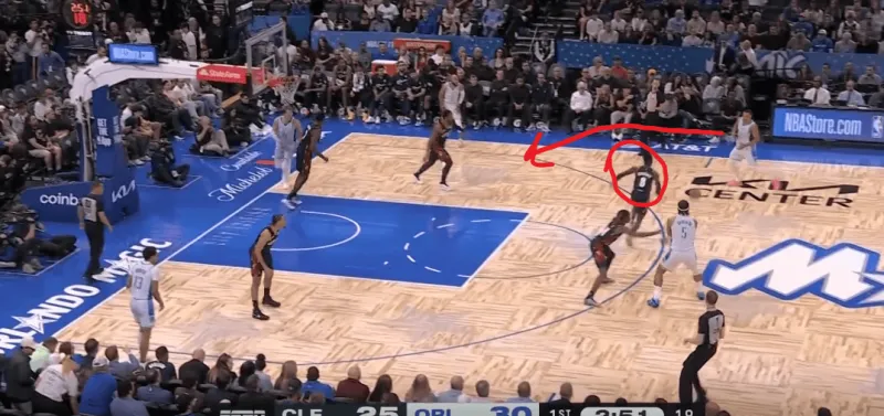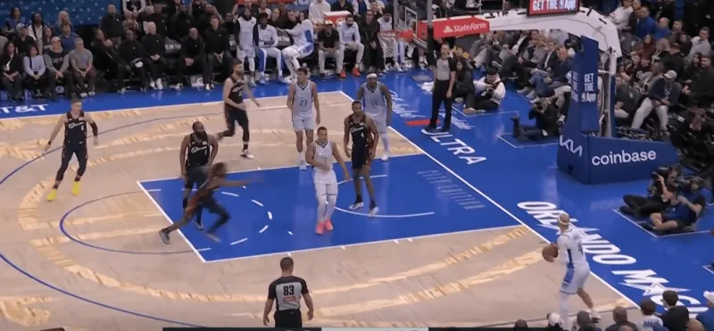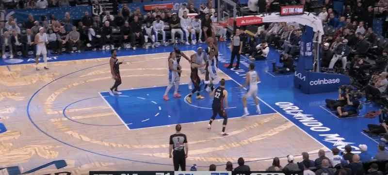 关键回合的底线球,贝恩先是为班凯罗掩护到低位要球,随后自己借卡特掩护兜出,萨格斯选择传球给跑出空当的贝恩,后者高难度接球三分命中杀死比赛: