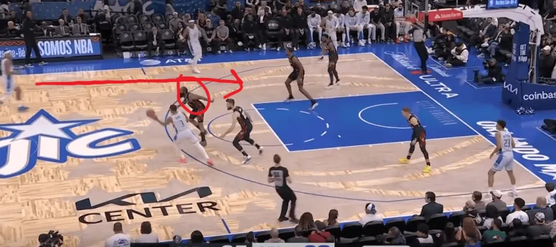 反过来,贝恩持球时,哈登在左侧刷卡,贝恩迅速单手出给接应的班凯罗,后者直接加速启动突破回收补防的哈登突破完成终结: